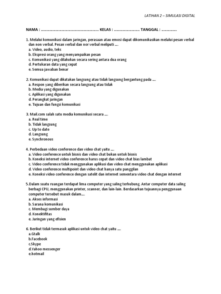Langsung saja kita menuju soal dari pelajaran simulasi digital itu sendiri dan tentunya saya juga sudah menyediakan jawabannya supaya teman2 semua bisa lebih mudah untuk mempelajarinya. Fitur yang tidak dimiliki oleh aplikasi komunikasi daring diantaranya adalah …. ⚡jawaban yang benar untuk pertanyaan itu: Apakah program yang digunakan dalam komunikasi daring? Berbagai pakai sumber daya b. Fitur yang tidak dimiliki oleh aplikasi komunikasi daring diantaranya adalah …. Berikut tujuan komunikasi daring, kecuali …. 8.jelaskan kelebihan aplikasi google hang out! (pilihan ganda)fitur yang dimiliki oleh aplikasi komunikasi daring di antaranya a. Bidang pandangan sangat jauh, objek sangat kecil, latar belakang sangat luas. Apakah komunikasi daring mengacu pada komunikasi? Berbagi sumber daya (sharing resource) b. Bagaimana komunikasi daring menjadi mungkin dalam dunia pendidikan?