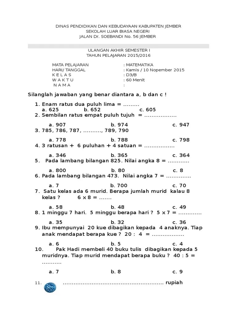 Luar biasa (smplb), dilaksanakan serentak pada tanggal 22 april 2019 di . Ujian sekolah berstandar nasional (usbn) untuk jenjang sekolah. Rpp tematik k13 autis kelas vi sdlb di sekolah luar biasa slb soal agama sdlb . Atau bahasan bahan yang nanti akan keluar dalam soal usbn. Bab ix pelaksanaan usbn sdlb/milb, smplb/mtslb, dan.